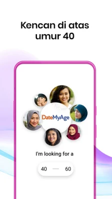 DateMyAge membantu bujang 40+ mencari cinta dan teman hidup. Temui lebih 1 juta individu dewasa berfikiran sama untuk pengalaman temu janji dalam talian yang bertenaga, mengekalkan keseronokan hidup, dan membuat anda rasa muda kembali.